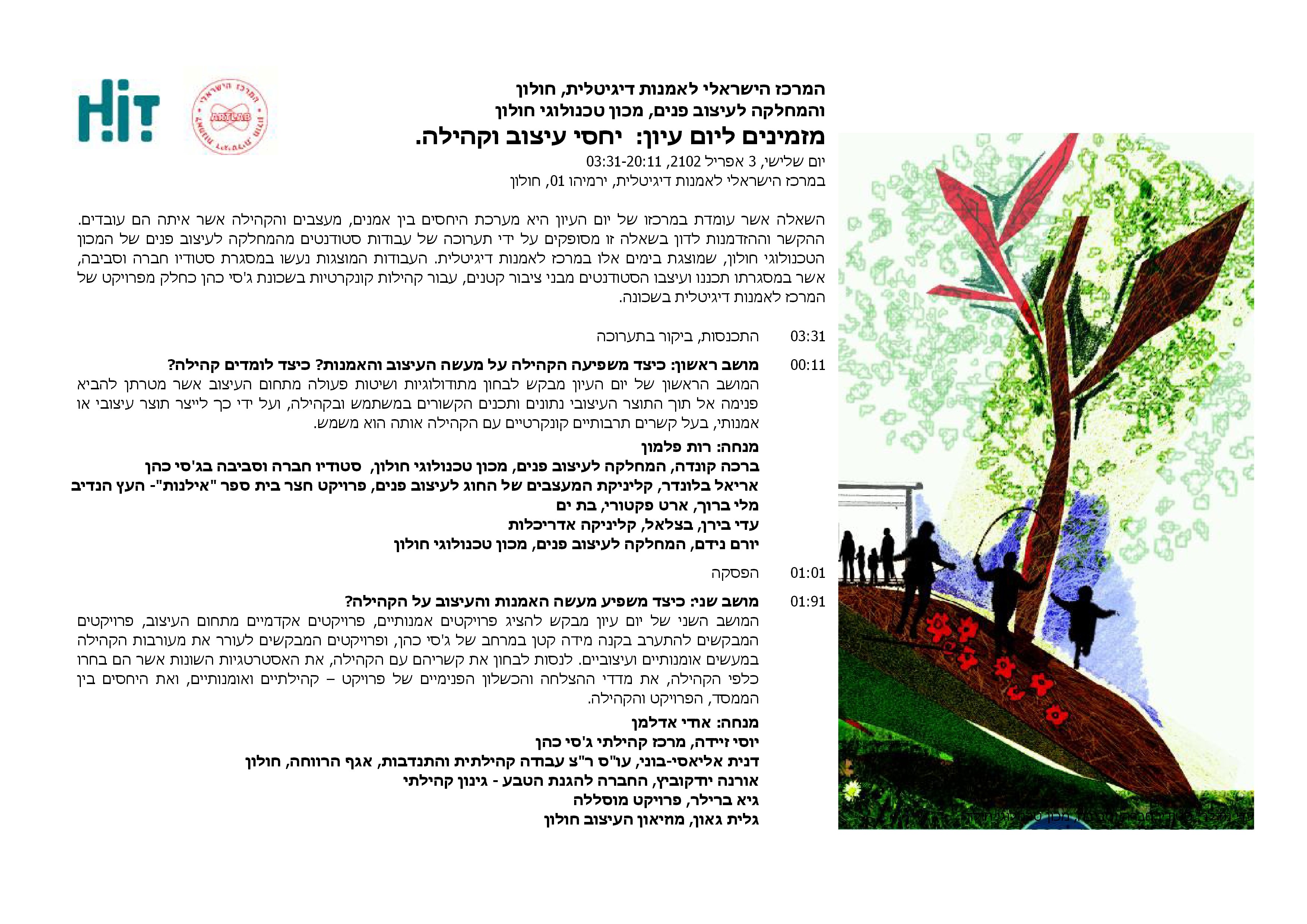 השאלה אשר עומדת במרכזו של יום העיון היא מערכת היחסים בין אמנים, מעצבים והקהילה אשר איתה הם עובדים. ההקשר וההזדמנות לדון בשאלה זו מסופקים על ידי תערוכה של עבודות סטודנטים מהמחלקה לעיצוב פנים של המכון הטכנולוגי חולון, שמוצגת בימים אלו במרכז לאמנות דיגיטלית. העבודות המוצגות נעשו במסגרת סטודיו עיצוב לקהילה, אשר במסגרתו תכננו ועיצבו הסטודנטים מבני ציבור קטנים, עבור קהילות קונקרטיות בשכונת ג’סי כהן כחלק מפרויקט של המרכז לאמנות דיגיטלית בשכונה.